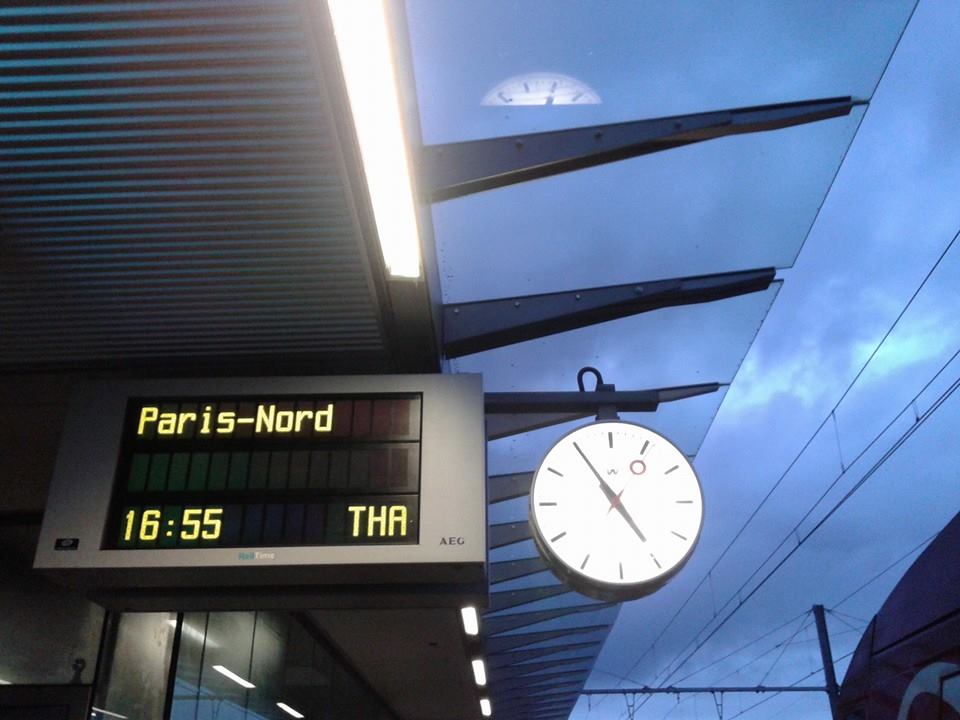 El andén de una estación y un gran reloj con rayas en lugar de números.
